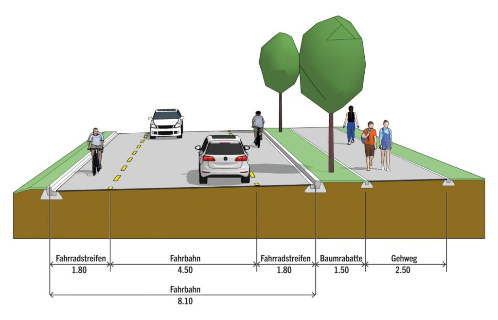 Die Strasse vom Embru-Kreisel bis zum Sonnenplatz-Kreisel würde zu einem klimagerechten und hitzereduzierten Strassenabschnitt mit mehr Bäumen, Tempo 30, einseitigem, breiten Trottoire mit Rabatten und mit Velostreifen umgewandelt und das für sage und schreibe rund 10 Mio. Franken.